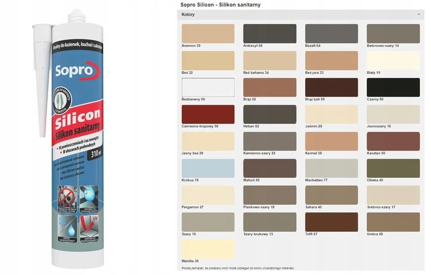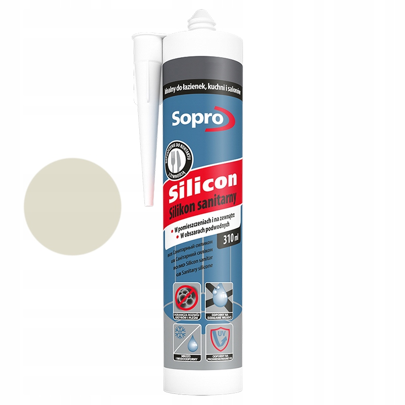 Silikon sanitarny Sopro jest gotowym do użycia, utwardzającym się pod wpływem kwasu octowego silikonowym materiałem uszczelniającym, o działaniu ograniczającym rozwój grzybów, który przeznaczony jest do elastycznego wypełniania spoin łączących i dylatacyjnych w pomieszczeniach sanitarnych, również między okładzinami z płytek a wanną kąpielową, brodzikiem, umywalką lub zlewozmywakiem, muszlą klozetową, pisuarem, itp.