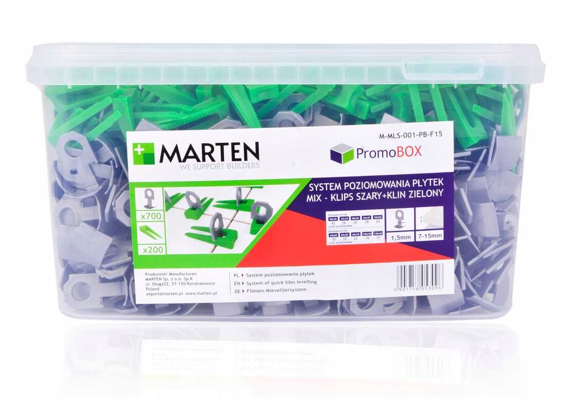 System Marten-Level eliminuje potrzebę używania standardowych krzyżaków i używania cęg oraz innych dodatkowych narządzi. Wykonany z elastycznego tworzywa, wyklucza uszkodzenia glazury na jej narożach. W jego skład wchodzą jednorazowe, zrywalne klipsy, działające jako podstawki pod płytki oraz stabilne kliny o dwóch nóżkach z ząbkami poziomującymi, dociskające glazurę do powierzchni podstawki. Po montażu kliny nadają się do ponownego wykorzystania. System sprawdza się w poziomowaniu kafelków różnego typu, rozmiaru i grubości. Pomaga w szybkim i łatwym ułożeniu płytek, gwarantując oszczędność czasu i efektywność pracy płytkarza. Minimalna szerokość fugi przy układaniu glazury powinna wynosić 1,5 mm. Produkt opatentowany. Skierowany zarówno do profesjonalistów, jak i majsterkowiczów.