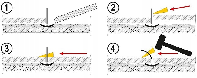 - Włóż klin w otwór klipsie i dociśnij aby wyrównać kafelki względem siebie.