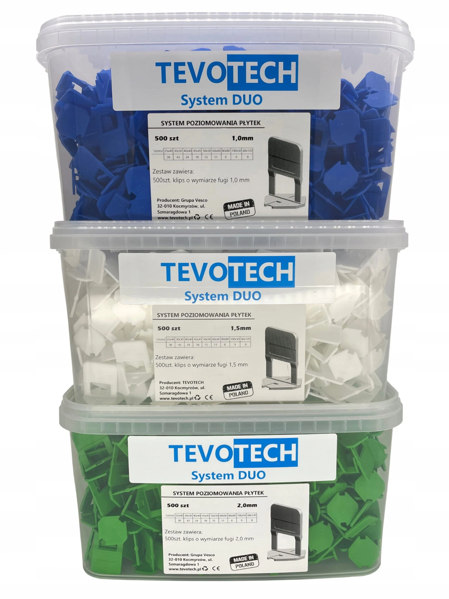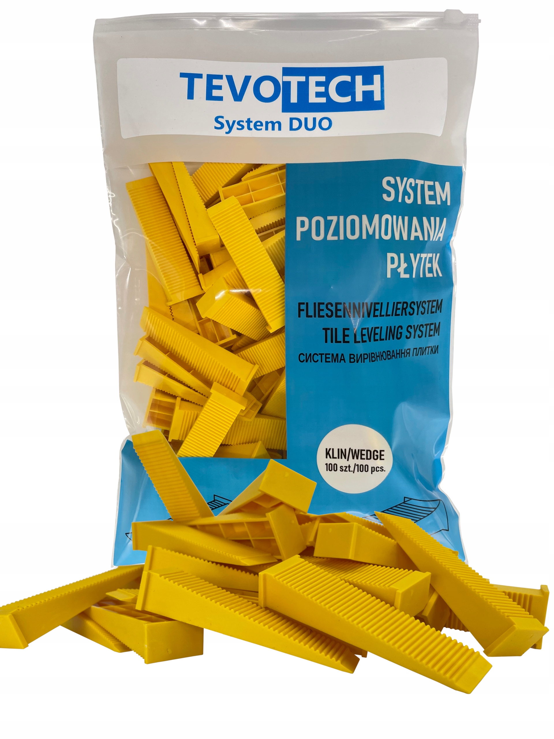 System DUO Tevotech to produkt wysokiej jakości. Klipsy są w stanie przenieść wysokie obciążenia przez ich mocną budowę, dzięki czemu nie trzeba martwić się o pęknięcie klipsa podczas zaciskania. Idealne do dużych formatów płytek.