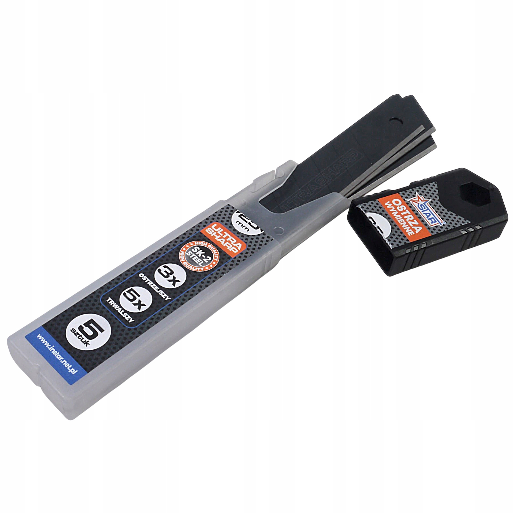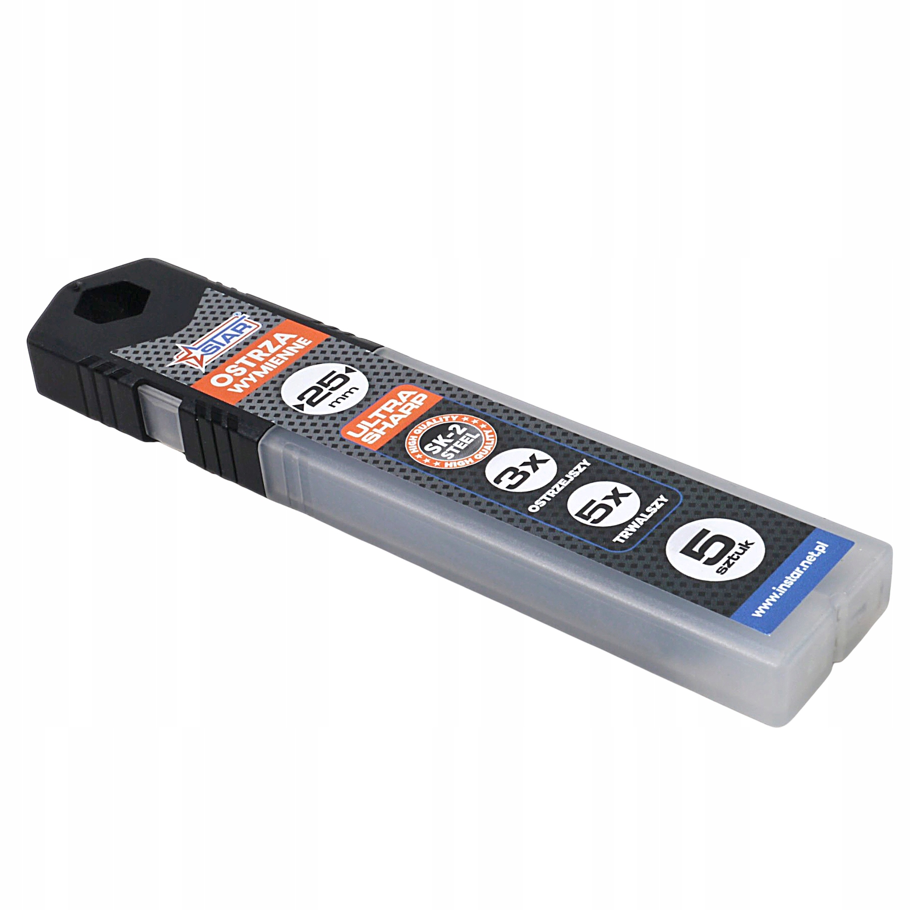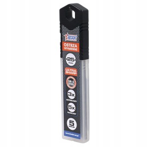 Pasują do większości nożyków 25 mm, w tym modeli z mechanizmem automatycznej blokady czy obudową ABS Soft. Konstrukcja zapewnia stabilność ostrza w uchwycie, co minimalizuje ryzyko wypadków. Wielopaki po 5 sztuk pozwalają na długotrwałe użytkowanie bez częstej konieczności zakupu nowych ostrzy.