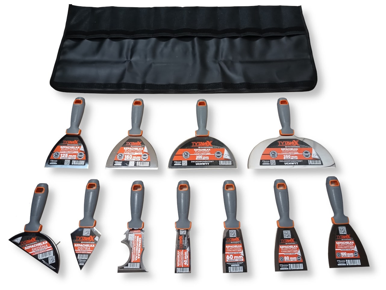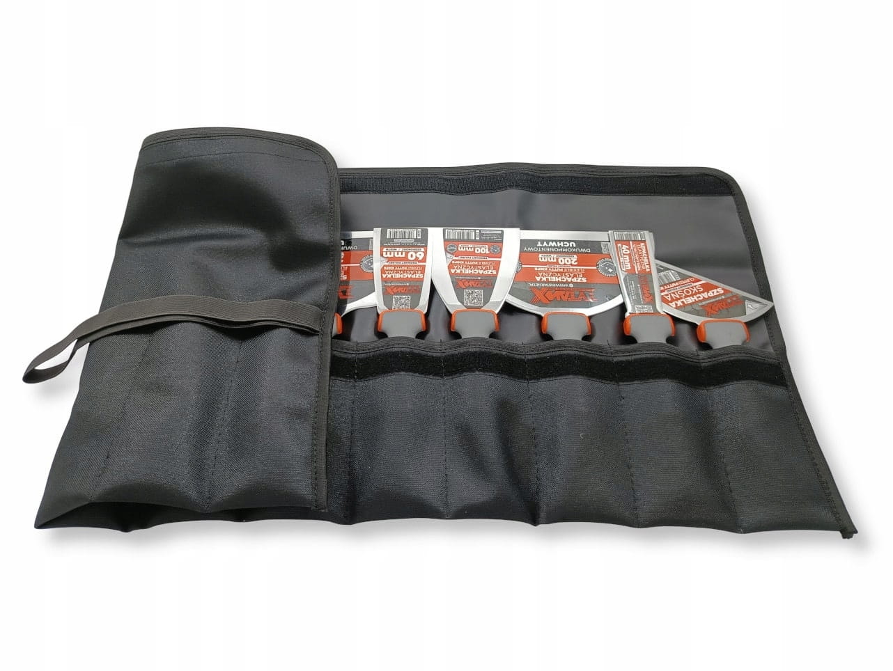 Zestaw szpachelek zapakowany jest w wygodne etui, wykonane z wysokiej jakości materiałów. Szpachelki umieszcza się w kieszonkach, zakrywa górną częścią etui, a po złożeniu na 3 zakładki, zabezpiecza gumową opaską. Oryginalne etui posiada logo TYTANX.